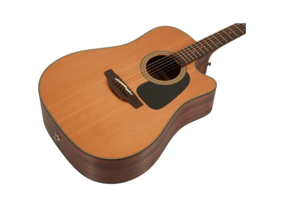 Về chất liệu, mặt đàn được làm từ gỗ tuyết tùng nguyên khối, cho âm thanh mềm mại và tròn tiếng. Lưng và hông đàn sử dụng gỗ Sapele ép ba lớp – loại gỗ có đặc tính cộng hưởng tốt và độ bền cao, thường được so sánh với Mahogany nhưng có dải tần rộng hơn. Cần đàn được làm bằng gỗ gụ, mặt phím sử dụng gỗ cẩm Ấn Độ, tạo cảm giác thoải mái và chắc tay khi chơi. Thiết kế tổng thể theo dáng dreadnought – dáng đàn phổ biến nhất hiện nay – giúp mang lại âm bass dày và uy lực, rất phù hợp cho người chơi đệm hát hoặc strumming.