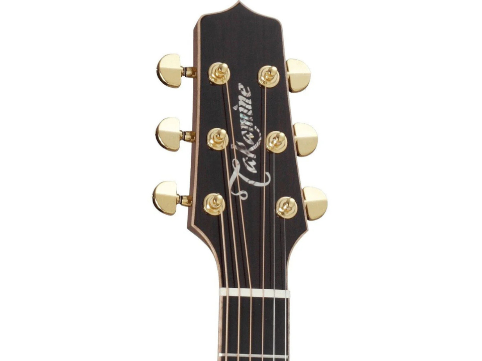 Headcap bằng gỗ Hồng mộc tối màu kết hợp logo Takamine khảm xà cừ nổi bật,