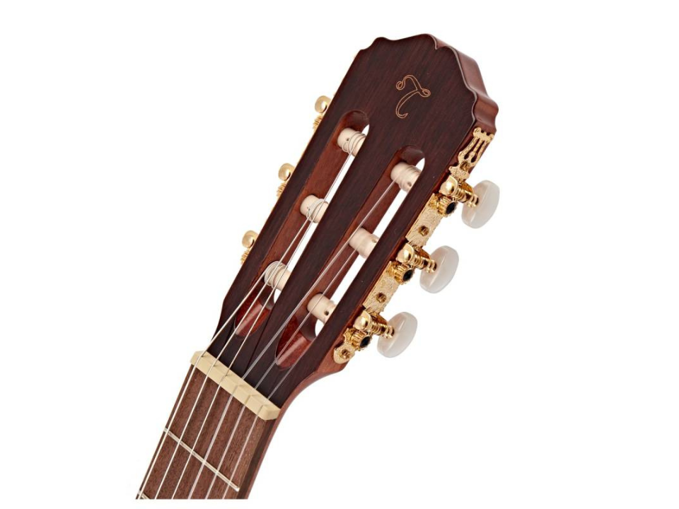 Ngoài ra, các chi tiết khác cũng được chăm chút kỹ lưỡng: lược đàn và ngựa đàn bằng xương tổng hợp, đầu đàn bằng gỗ Hồng mộc, bộ khóa dây mạ vàng với nút vặn màu trắng ngọc, góp phần tăng độ bền và vẻ sang trọng cho cây đàn.